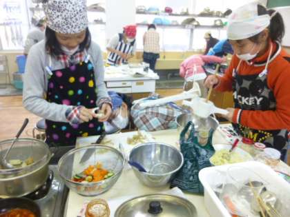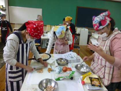 2組に続き,今日はいよいよ1組の調理実習。グループの子と協力しながら作業していました。味付けや盛り付けも慎重に行っていました。4時間目ごろから,おいしい香りが部屋中香り,なんと3階までその香りが届いていたそうです。