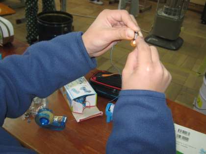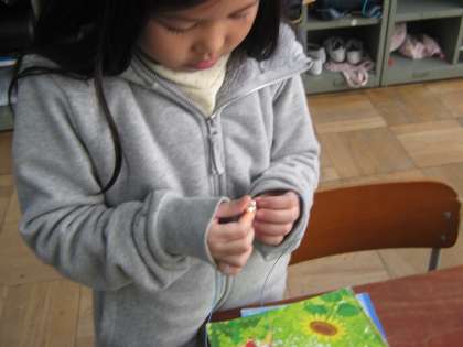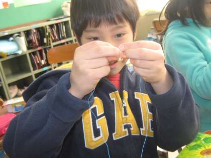 「ソケットがないときでも豆電球にあかりはつくか?」を予想して実験しました。実験のための導線を用意し,いざ実験。「先生。つきません」の声があちこちから。でもある児童が「ついた!」と明りのついた豆電球を上にかざして見せました。乾電池から延ばした導線を,豆電球の決まった場所に付けることに気付いた瞬間でした。それからは,全員が豆電球に明かりをつけることができました。