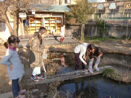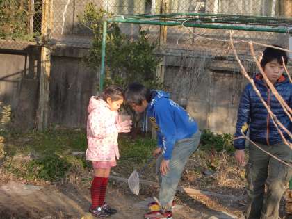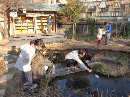 子どもたちがエビをねらっています。バランスを崩して池に落ちたら大変です。凍ってないからと言って水が温かいはずはありません。