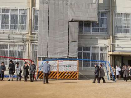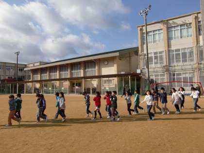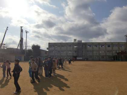 四錦では月に1回のペースで休み時間の子どもたちが自由に過ごしている時間をねらって,地震対策の訓練(『シェイクアウト訓練』と呼んでいます)を行っています。