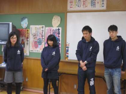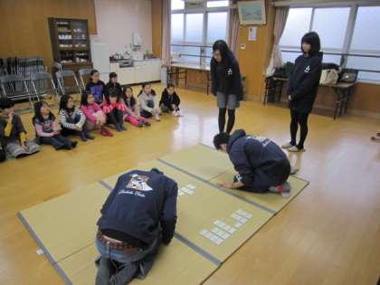サタデースクール『カルタを楽しもう』がありました。はじめに、同志社大学の4人の学生が百人一首の競技カルタを見せてくれました。それを見て何人かの子どもたちも挑戦しました。