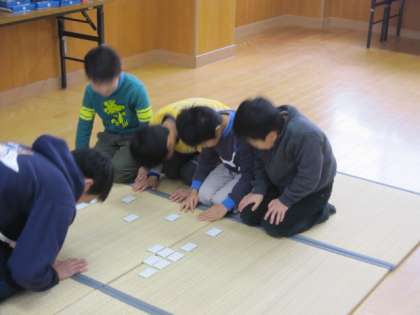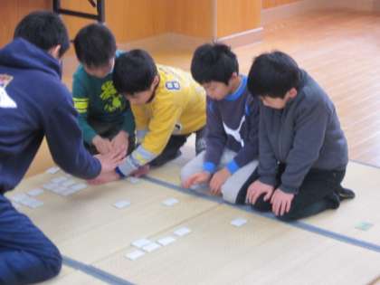 子どもの中には、競技カルタの経験のある子もいました。でも、初めての子どもたちもたくさんで挑戦しました。また、もう上の句だけで下の句が分かる子どもたちも、自分で札を決めてお兄さんに挑戦していました。