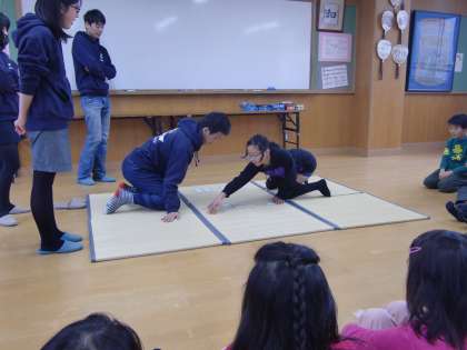 まずは百人一首。ルールを説明して,実際に見本を見せて,そして試しに子どもにやらせて…。四錦には大人顔負けのカルタ名人だっているんです。