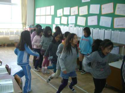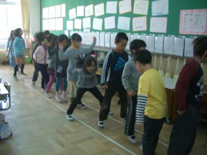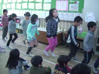 音楽の時間に「ティニックリング」というフィリピンの民謡を学習しました。フィリピンでは,竹を使って踊りながら歌うそうです。フィリピンから来た子どもたちが,みんなにどんな踊りかを教えてくれました。残念ながら竹はなかったので,床にテープを貼ってみんなで楽しく体を動かしました。楽しい曲と踊りにみんなにこにこでした。