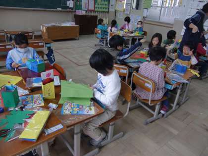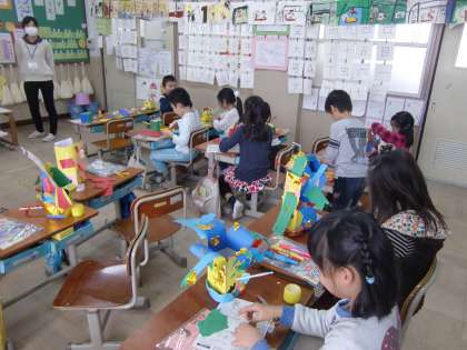 インフルエンザやカゼで2年生が1・2組とも学級閉鎖になりました。拡大を防ぐためには仕方がありません。2年生は非常事態の措置をとりましたが,1年生は元気です。『ニョキニョキとびだせ』という工作にチャレンジ中です。