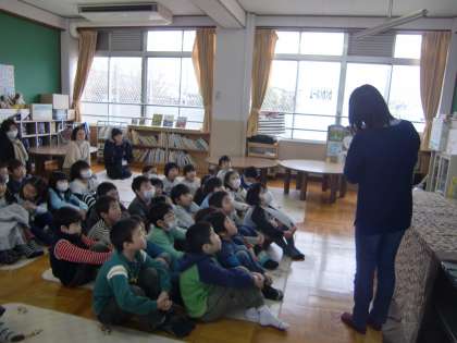 2の2が学級閉鎖中ですから,普段より少し人数は少なめですが,それでもたくさんの子が集まりました。低学年の子らに根強い人気の読み聞かせ会です。