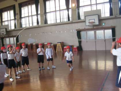 始めは,なわをくぐるタイミングをつかむのが難しかったようですが,そのうちに子ども達が考えて,「ハイ,ハイ」と声をかけ始めました。そうすると,タイミングがつかみやすくなったようで,何度もしていくうちに,どんどん続けてくぐりぬけられるようになってきました。