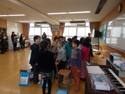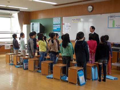 学習の場を「ふれあいサロン」にして,友だち同士で役割を交代して「THANK YOU」バッグを作りました。色々な学校から来て下さった先生に初めの挨拶を元気よくしました。