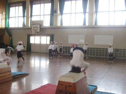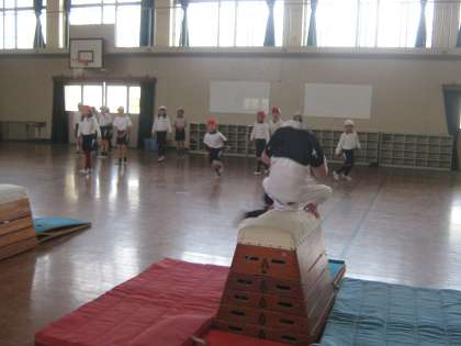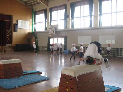 3年生の跳び箱で,「台上前転」を頑張って学習しています。前回よりも高い段の跳び箱を成功したという児童が何人もいました。教室のパソコンでも模範演技のビデオ教材を見ていて,意欲が高まっています。