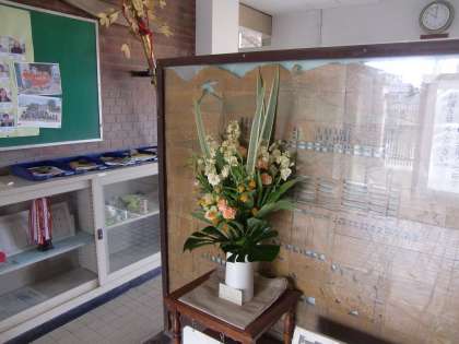 2月7日の研究発表会用にPTAから玄関の花をいただきました。いつも変わらぬお心遣い,痛み入ります。ありがとうございます。ここにだけ,一足早く春が来たようです。