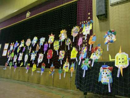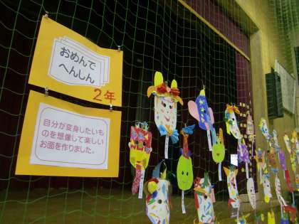 2年生は絵画作品と立体作品として『お面』を展示しました。