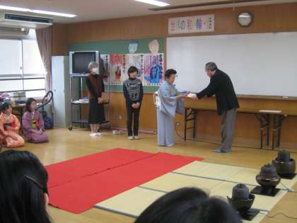 最後に,校長先生から,茶道部の先生方に感謝状が贈られました。