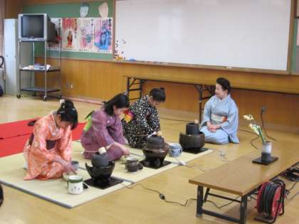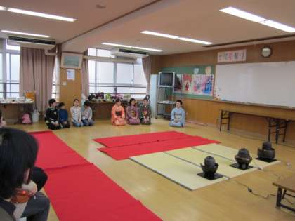 6年生は、着物を着て、お点前を披露します。