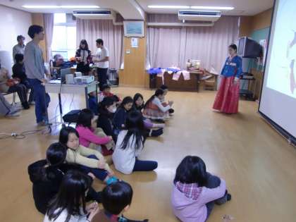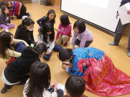きれいな民族衣装チマチョゴリを着ておられますが,子どもたちが,「韓国の女性はみんなこういう服装なのか…」と勘違いしないようにせねばと思っています。現在,日常生活の中で着物を着ている日本人女性の方がチマチョゴリを着ている韓国人女性より率は高いのではという話でした。