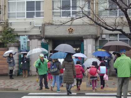 小雨の中の声かけ登校