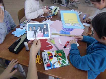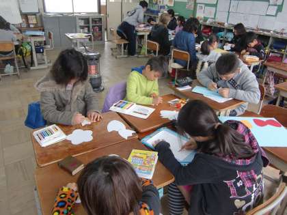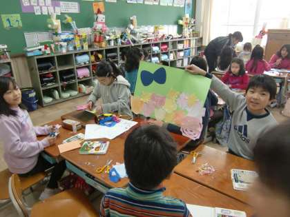 3時間目は『にこにこタイム』です。縦割り班による活動ですが,今日はどの班も6年生がいません(市内オリエンテーリング)。その6年生がいない時を利用して,6年生へのプレゼントを手作りしました。