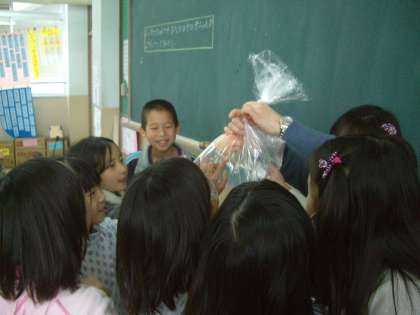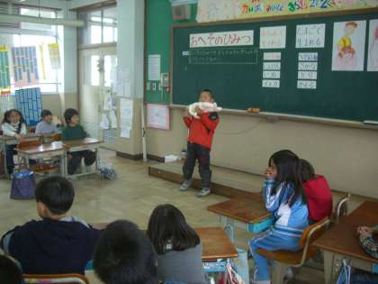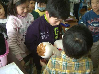 学活の時間に「おへそのひみつ」を学習しました。「おへそあるなしクイズ」をしたり,赤ちゃんの人形を使ったりしながら,おへそのはたらきや胎内での赤ちゃんの簡単な様子について学習しました。お母さんと赤ちゃんが力を合わせて生まれてきたことに子どもたちは,驚いていました。
