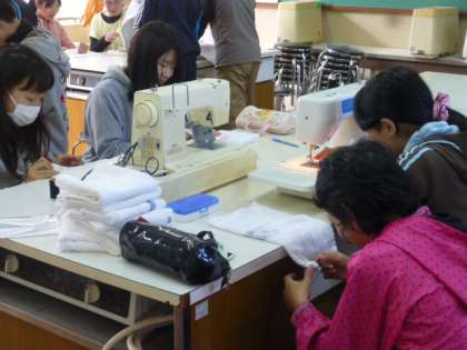 家から持ち寄ったタオルを使って各クラスにプレゼントする雑巾作りをしました。ノルマは少なくても1人2枚!