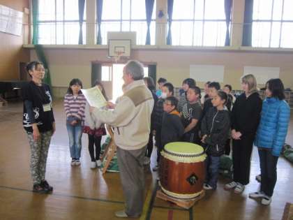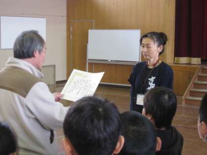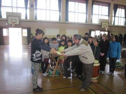今日の「和太鼓ミニ発表会」の後に、いつも和太鼓を指導してくださっている地域の方に感謝状をお渡ししました。寒い日も暑い日も、少しでも音がもれないようにと閉め切った部屋の中で練習し、大きな音の中で熱心に指導してくださっています。練習を通して、子どもたちが、自信を持てるように変わってきたと感じます。ありがとうございました。