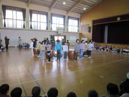 今年の和太鼓部は、6年生がいません。でも、迫力満点の演奏をしてくれました。特に4年生の男の子の力強さや3年生の女の子の真剣な表情がとてもすてきでした。中間休みに素晴らしい演奏をありがとう。