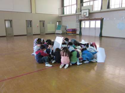 1年生は,体育館にいたので,中央に集まり体を低くして頭を守りました。