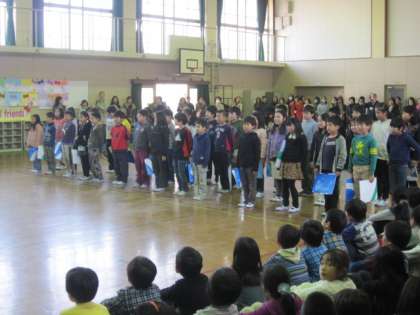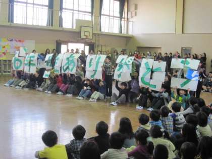 3年生は、歌といっしょに素晴らしい文字をつくってくれました。「6年生ありがとう」「かがやくみらいを」と一瞬の出来事に、6年生も驚いていました。3年生の協力が感じられた発表でした。