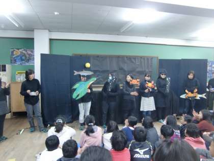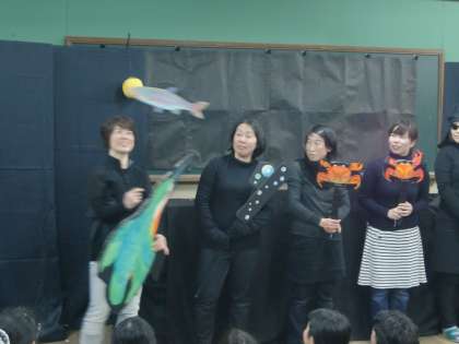 『やまなし』上演後の写真です。真っ暗な中で息を殺して様々なものを操作していたスタッフが紹介されました。