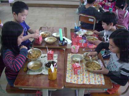 「先生,カレーも2年生最後やなぁ。」と子どもたち。1年生の頃は,カレーが辛いと言って食べられない子もいたなぁと懐かしくなりました。みんなの大好きな給食もあと2回です。