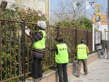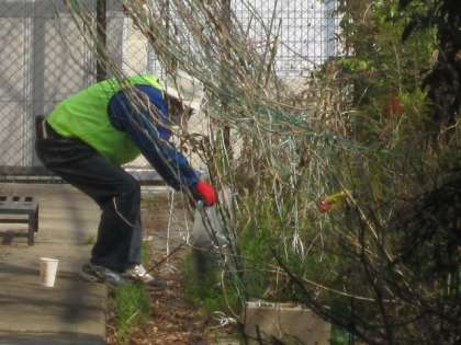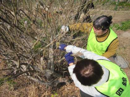 ビオトープ・園芸作業日の最終日は、「ねこやなぎ」の剪定や「リュウキュウアサガオ」の手入れでした。ねこやなぎの枝の下の方は複雑に絡み合っていて、剪定するのも大変でした。しかし、リュウキュウアサガオのつるは、上にだけではなく、横に伸び、どこまでも伸びているので、手入れをするのはねこやなぎどころではありません。最終日もご苦労様でした。