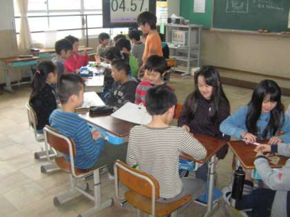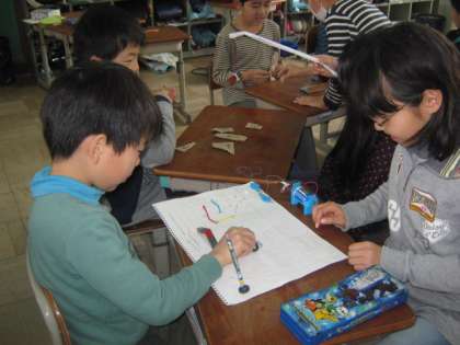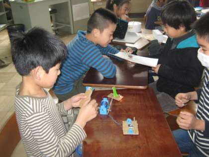 先週に作った,ゴムや磁石の力を利用したおもちゃ。今日は,前半と後半に分かれて,紹介しながら遊び方も教えました。磁石を使った迷路は,人それぞれに細かい工夫があって,とても楽しめました。