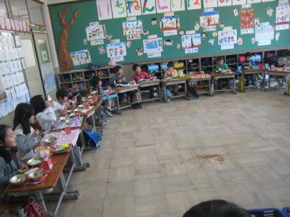 1年生最後の給食は,机を大きな輪の形につなげて,みんなでおいしく頂きました。