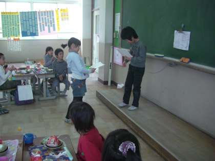 環境委員会のお兄さんが,クイズラリーの結果を知らせに来てくれました。全問正解は…残念ながら,いませんでした。しかし,数問間違った子は,「おしかったで賞」の賞状がもらえ,みんな喜んでいました。