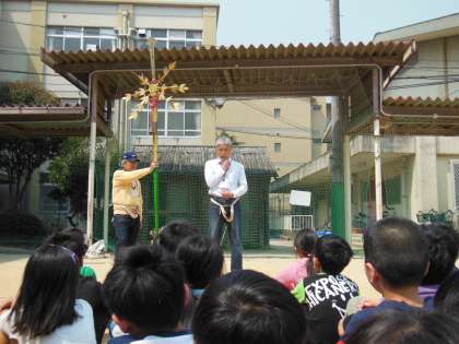 今日は,地域の方々に来ていただき剣鉾の体験をしました。校舎を入るとすぐに置いてあるので,いつも子どもたちは何気なく見ていただけに初めて持つ剣鉾にわくわくしていました。剣鉾の伝統ある歴史や刻印や形などについても説明していただきました。