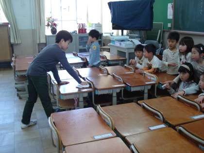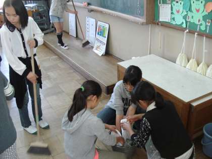 じーっと見られて照れている6年生でしたが,ほうき・机・ぞうきんなど,10分の時間で1年生の教室をきれいに掃除しました。