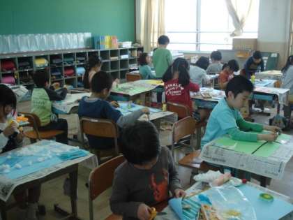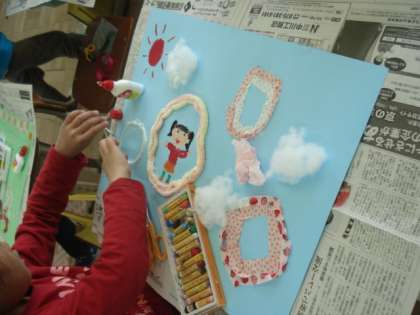身の回りのものから,いいなと思ったものを使って画用紙に思い思いに表現していきます。