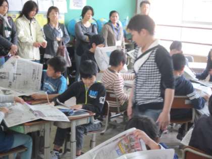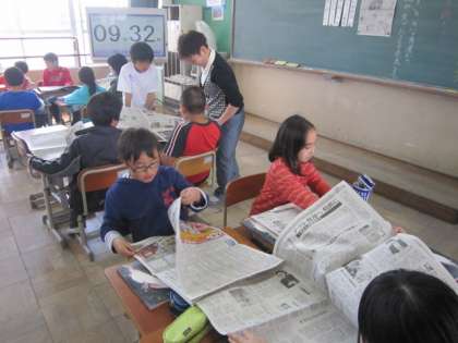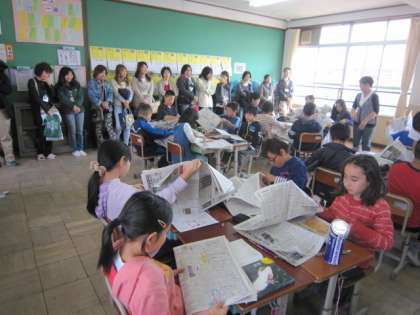 5年生は新聞を使っての学習でしたが、グループでいっしょに活動する様子も観ていただきました。大きな新聞を扱うのは難しかったようですが、みんなで協力できていました。