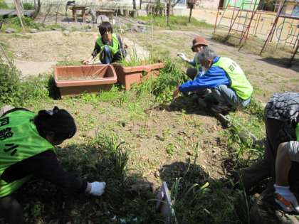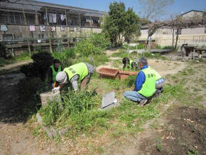ビオトープのボランティアさんが今年度も、ビオトープの手入れや管理をしてくださいます。今年度はじめの作業日は、春のあたたかな、明るい日差しの中で行われました。まずは、蝶の来るフジバカマの芽を守るため、近くの雑草の処理をしてくださいました。近くには春の花がたくさん咲いています。時間があれば、ビオトープに少し足を運んでみてください。
