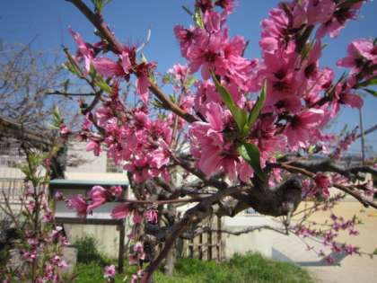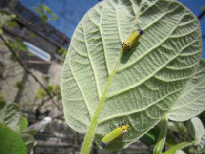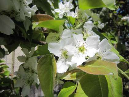 ビオトープには実のなる木がたくさんあります。白い梨の花が咲いています。キウイは花はまだですが、新しい葉が大きくなってきました。葉の裏には、ヨコバエの仲間がいました。桃の花は満開です。リンゴはこれからさきそうです。