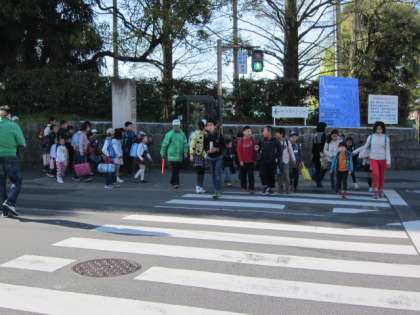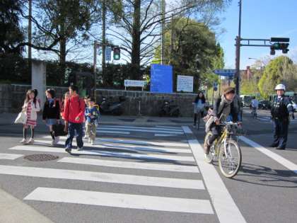 東大路の交差点での朝の登校の様子です。