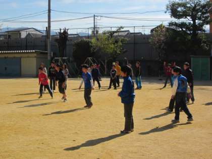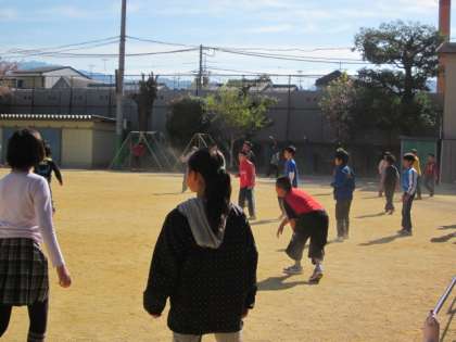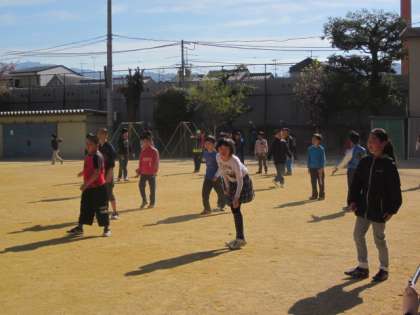 以前からのドッジボールの場所ですが、5,6年生が一緒にドッジボールをしています。