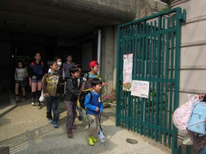 集団下校です。町別集会で確認した2列になって、担当の先生、PTA地域委員さん、みまもる隊のみなさんと一緒に下校します。
