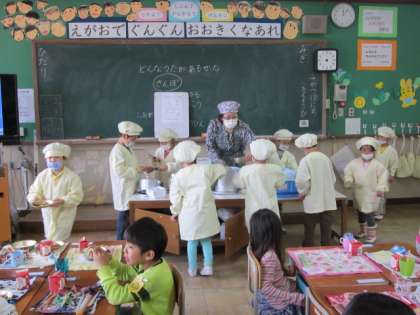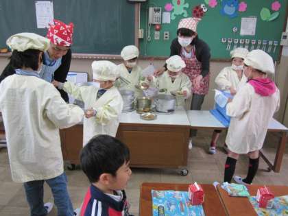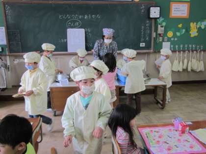 エプロンと帽子、マスクをして、一所懸命に当番をする姿は、りりしくもあり、かわいくもあります。