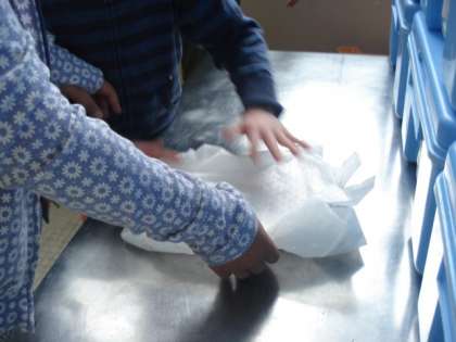 給食のごはんが入っていた紙,自分たちの力でとてもきれいにたたんでいました。