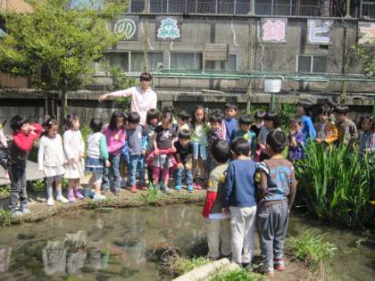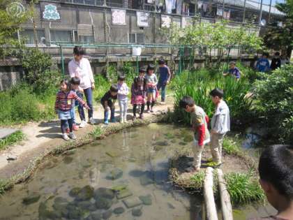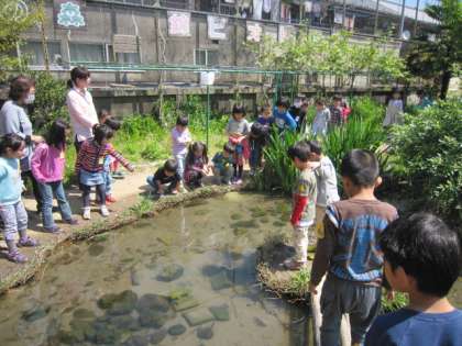 ビオトープの池に、1年生がやってきました。何人かがメダカやザリガニを発見しました。池のふちにいつの間にか子どもたちがいっぱい集まってきました。