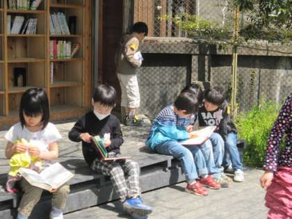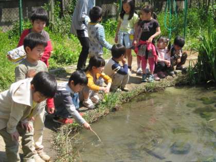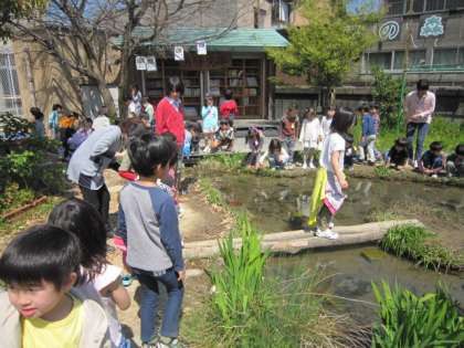 ビオトープにやってきた1年生は、それぞれいろんなことに興味をもっていました。一本橋を渡りたい子。月澤文庫の本を読む子。池の生き物をじっと見つめている子。それぞれがゆっくりとした時間の中で、ゆったりとした時間を過ごしていました。ビオトープは子どもたちのパラダイスです。
