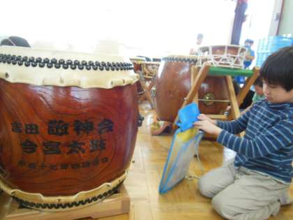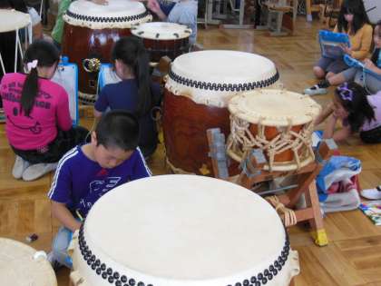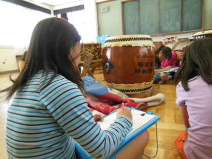 今日は,和太鼓を調べに行きました。先日体験したこともあり,子どもたちは和太鼓の形や大きさに興味を持ち,細かいところまでスケッチしていました。その中で,「和太鼓の中はどうなっているんだろう」とか「たたく所にある模様はどんな意味があるんだろう」など次々と疑問が出てきました。何気なく見ているだけではなく,よく見るからこそ不思議に思うこともあったようです。