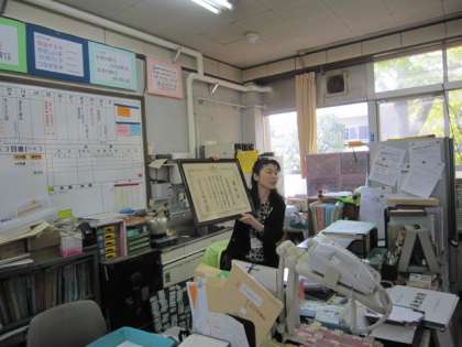 昨日、東京の国立オリンピック記念青少年総合センターというところで、子どもの読書活動に関するフォーラムが開かれました。その中で、「文部科学大臣賞」の式典があり、そこで四錦小が「優秀実践校」として表彰されました。校長先生が四錦を代表して立派な賞状をいただいてこられました。写真は、職員に披露されているところです。