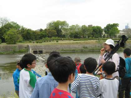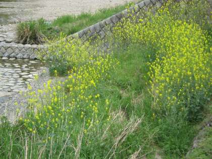 鴨川に着きました。川岸に生えているあの黄色い花は何でしょう・・・?アブラナ・・??