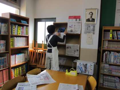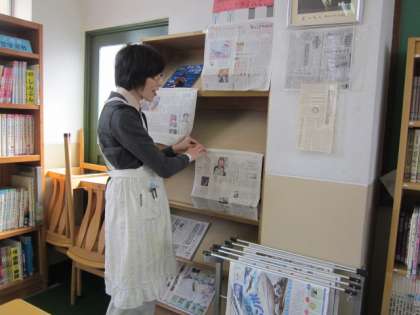 授業に必要な図書、また関連する図書を準備してくださったり、また、図書に興味をもつようにレイアウトを考えたりしてくださっています。またNIEのことも考えて、新聞も活用してくださっています。本当に強力な助っ人です。