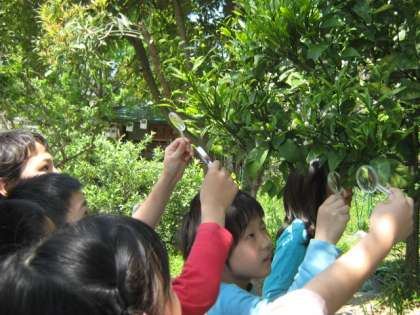 今日は,ビオトープにあるみかんの木をみんなでよく見て,アゲハチョウのたまごを見つけました。